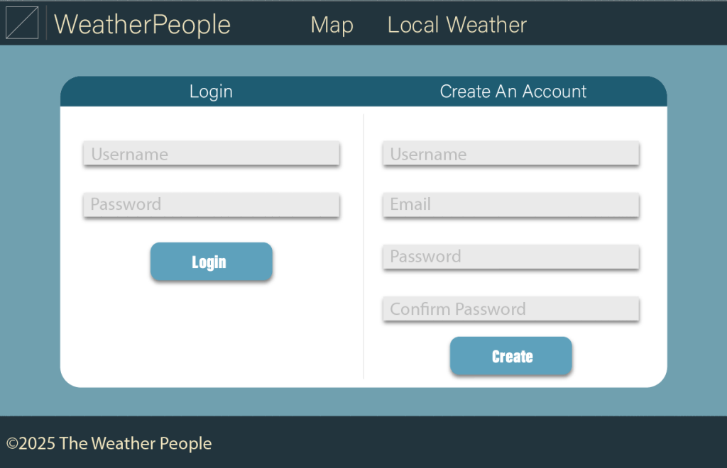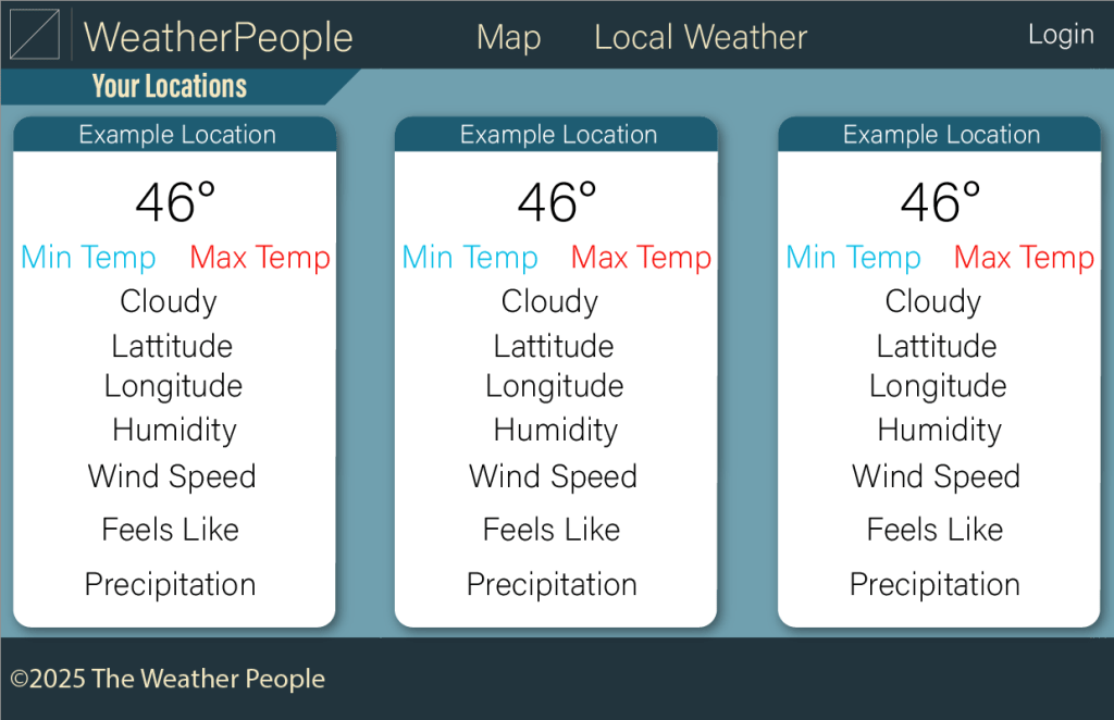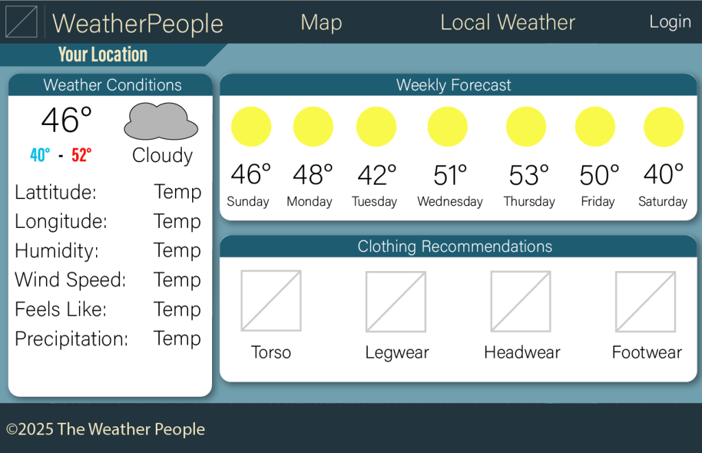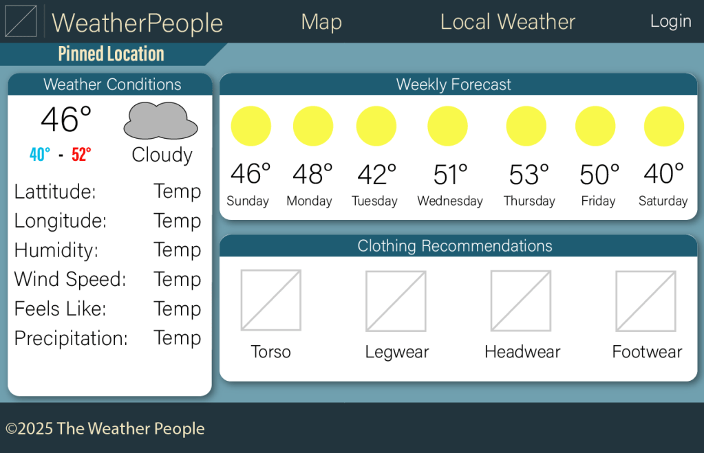 These are images of the wireframes I designed for Agile Development class. My team and I were tasked with making a weather tracking website with the ability to pin locations on a map. Many images on the wireframe are obviously temporary.